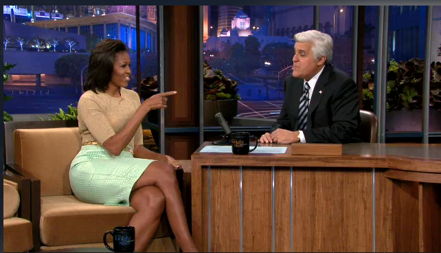 Yesterday, First Lady O was on the 'Tonight Show' with Jay Leno pushing healthy eating habits, talking about how President Obama loves to sing to her *sigh, and how the first baby girls Sasha and Malia are growing up and adjusting to the white house.